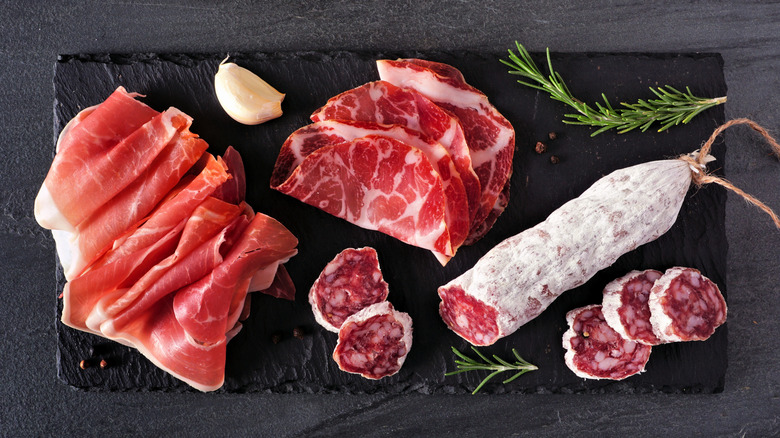 Another thing that's helpful when assembling your charcuterie board is to have all of your meats and cheeses pre-sliced ahead of time. Cheese tastes better at room temperature, but if you want to stave off foodborne illness, you're going to want to keep things chilled until you're ready to serve it. This is tricky, though, because you don't want to put the entire board in the fridge with the crackers on it since they will be soggy. If anything, leave the crackers and bread aside and refrigerate the rest of the board to keep it fresh.