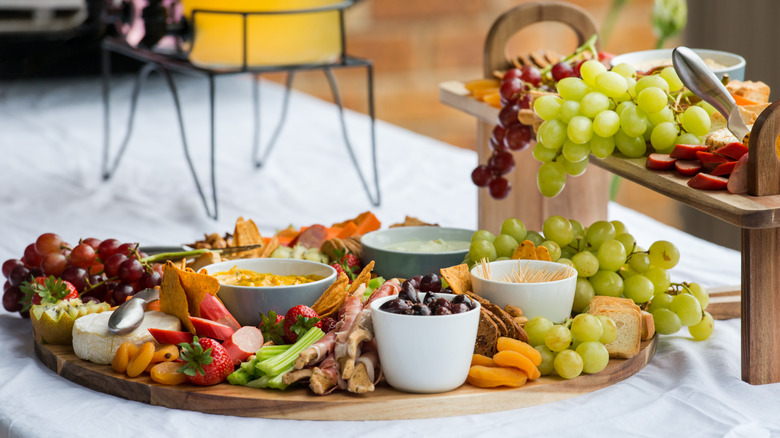 Kids aren't the only audience that you have to make sure is included in your charcuterie-ing. You may want to consider having a separate, plant-based charcuterie board for vegan and vegetarian guests or have separate options for folks with gluten intolerances and/or nut allergies. You can get a sense of how much food you need to include on these separate boards by asking if your guests have any dietary restrictions on your RSVPs. Though, you can probably assume that some of your guests are not going to eat the food on your regular board, so you might want to have something as a backup — just in case.
