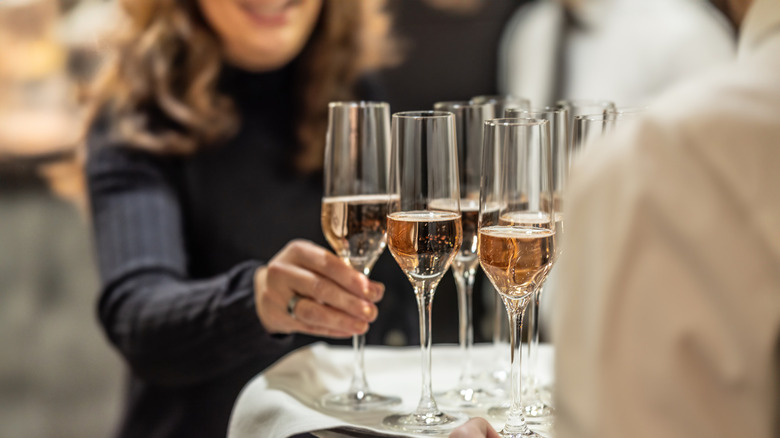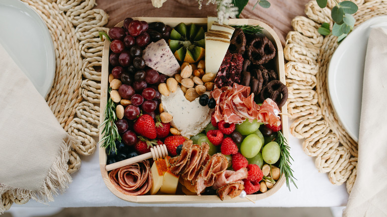 One of the most important things you have to consider when you're setting up a charcuterie board for any gathering is how much food to put on it. Evan Inada recommends serving about 2 to 3 ounces each of meat and cheese per guest, along with a similar amount of accompaniments, like crackers, preserved fruit, veggies, and the like. The exact number of varieties of cheese and meat to serve will depend on how many guests you have. In general, try to serve three to five different types of cheese, a couple of different varieties of meat, and several different kinds of crackers and other munchies. The more varieties you offer, the more likely a guest is going to find something that they like. You may also want to consider serving pork-free proteins to ensure that there's something for all of the guests at your celebration. But you also have to balance not going overboard with your meat and cheese budget (weddings are expensive as is, anyway).