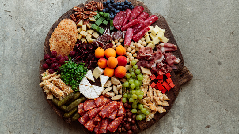 While the cheeses and meats are self-explanatory, "acid" and "crunch" may be a little more abstract. As far as acidic ingredients, you may want to consider adding some pickles, relish, or olives to your board. The crunch factor can come from tasty crackers or crusty pieces of sourdough, though you could also integrate crunchy veggies like carrots, celery, and cucumbers, and fruits like grapes to satisfy this part of the equation. Not only do all of these selections boast a quality taste and diverse texture, but they also come in many different colors and shapes — which will help to diversify the look of your board.