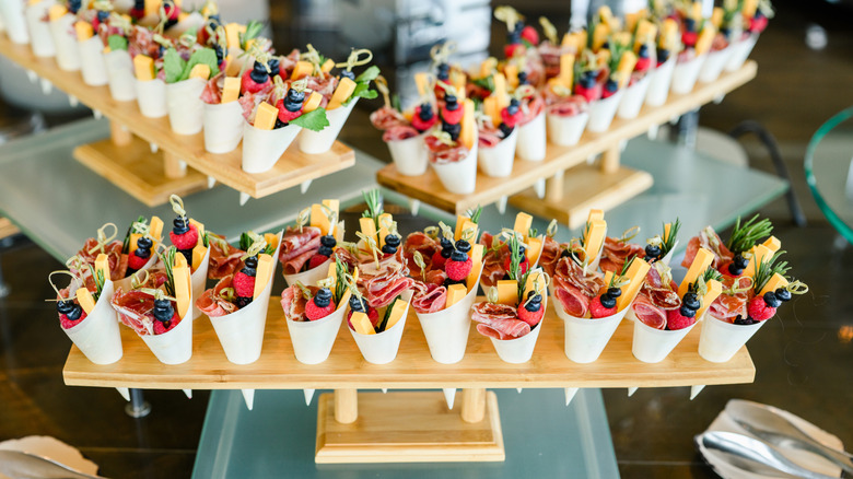 If you're making a charcuterie board for a very big wedding, you may find that it takes up significant amounts of table space. While this might be okay for a large venue, it may not be ideal for a small, intimate gathering where square footage is precious. Evan Inada shares that if you're struggling to build a space-efficient display, you should really consider building upwards rather than building outwards. "Building multiple levels for a grazing display really elevates the overall look of the spread and makes it more engaging and Instagram-worthy," he says.