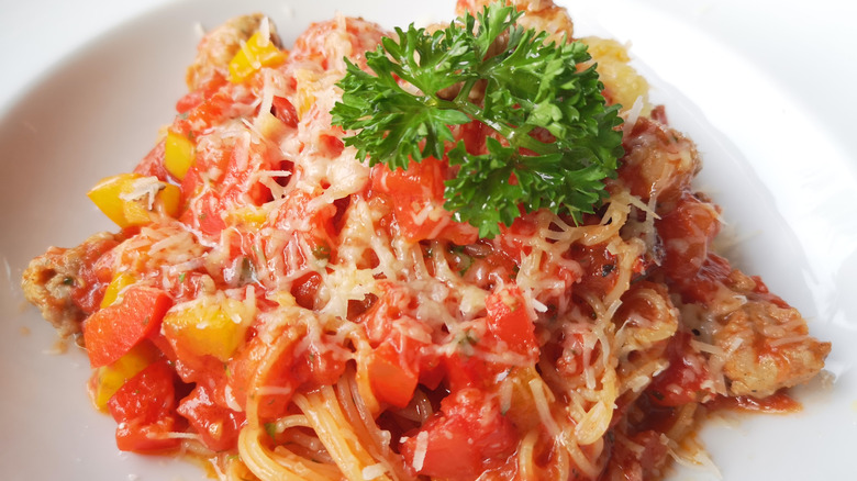 A simple tip for turning up the heat in your capellini recipe is throwing some red pepper flakes into the sauce. If you're sauteing onions and garlic as the base, this is the perfect time to introduce the dried flakes, which will release their warmth as they cook. Of course, you could absolutely use finely diced fresh chiles, such as serranos or jalapeños, in their place. For an extra layer of spice, add a dash of cayenne pepper or a dollop of chili paste.