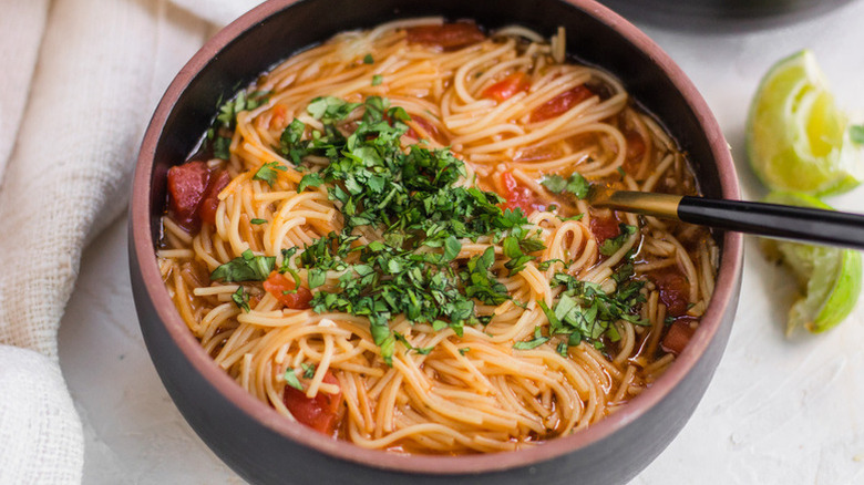There's also the option to add some extra veggies to your fideo, such as onion, carrots, zucchini, or asparagus. Just saute these at the beginning, set them aside whilst you toast the pasta, then return them to the pot with the broth and tomatoes. To give the soup a hearty protein boost, toss in some cooked shredded chicken or chunks of beef, too. And don't hesitate to add your favorite garnishes, such as a sprinkling of chopped cilantro and a squeeze of lime juice.