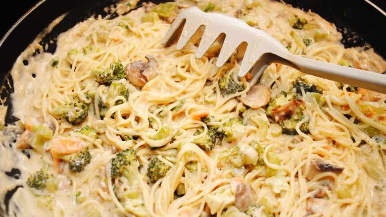 For a creamy and satisfying sauce that feels wonderfully balanced, simply stir a few dollops of cream cheese through your favorite tomato-based pasta sauce (jarred or homemade) before tossing this with cooked and drained capellini. The juiciness and acidity of the tomatoes keep things light and fresh, whilst the cream cheese adds that slight indulgent edge. Alternatively, try adding a splash of heavy cream to any broth-based sauce, whether that's a citrusy seafood recipe or a wholesome cheese and garlic mixture. Pairing the cream with broth will ensure the sauce retains a thinner consistency, perfect for tossing with the delicate pasta. Feel free to add in some veggies of your choice, too, such as broccoli, asparagus, or mushrooms.