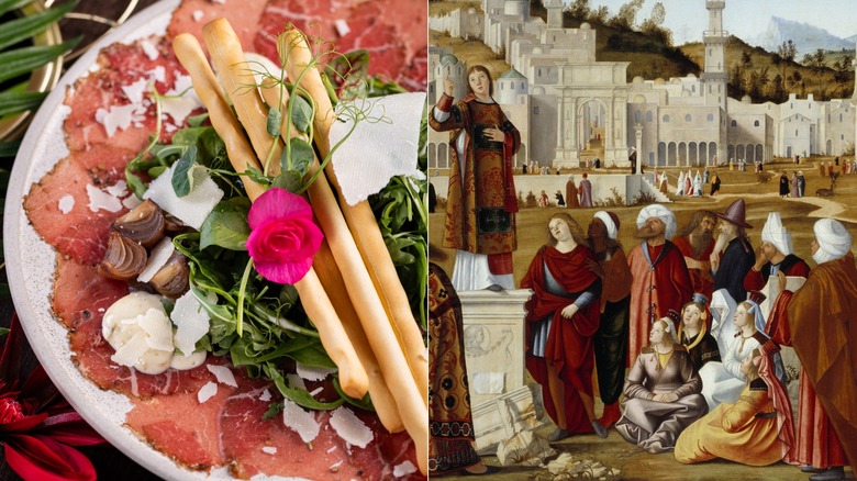 Take a look at the dish, and you'll see it's a rather beautiful arrangement that is, of course, largely defined by the reds in the raw meats. It's those colors that inspired Cipriani to name the dish after a Venetian artist Vittore Carpaccio, and a quick look at his body of works can make the connection very clear. Carpaccio's 1505 painting "Saint John the Baptist," for example, shows the barefoot saint wrapped in red robes, his "Portrait of a Woman" portrays a solemn-looking lady against a red backdrop, his "Two Venetian Ladies" depicts one wearing a deep red dress, and his "Salvator Mundi" pops from the canvas thanks to a red gown. (Pictured is his "Sermon of St. Stephen.") Interestingly, carpaccio isn't the only famous dish created at the restaurant and named for an Italian artist: Cipriani also created the Bellini cocktail, and named it for Venetian painter Giovanni Bellini.