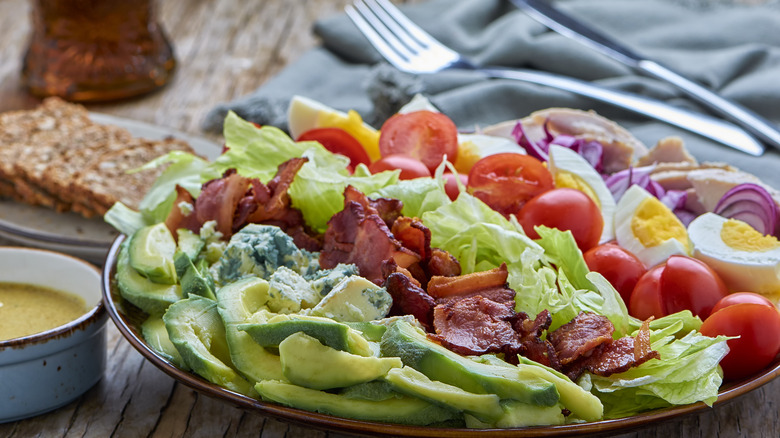 A dish doesn't have to be complicated to be delicious, and that's definitely the case of a classic Cobb salad. Sure, there are some staple ingredients like hard-boiled eggs, avocado, and sliced meats, but this salad is easy to dress up with whatever you might happen to have in the fridge. Skeptical? You shouldn't be, because that's exactly how the salad was created.