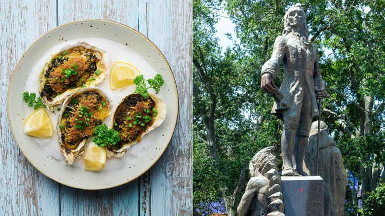 Oysters Rockefeller have been around for a long time — and yes, the dish is named after a member of the iconic American family. The story is a pretty neat one, and it starts with a New Orleans restaurant called Antoine's. Originally known for serving up snails, the turn of the 20th century was the time for something new. That ended up being a signature dish made from the area's plentiful oysters, and the idea of using "rich" to describe the dish was twofold. In addition to being a texturally rich experience, the green sauce was typically made with ingredients such as spinach, parsley, green onions, and shallots.