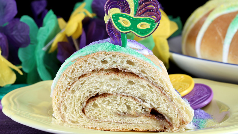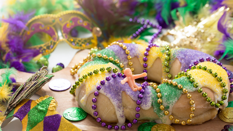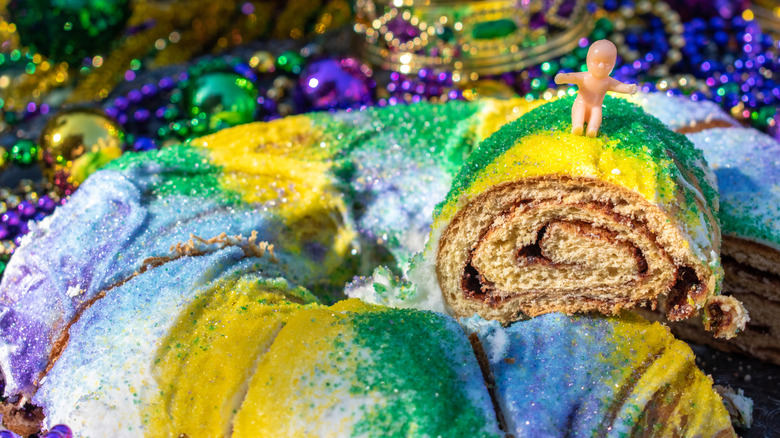While it might seem like a little bit of a weird tradition, adding a baby to a king cake is part of the experience. The baby is said to be representative of baby Jesus, but it's also a sign of luck and prosperity. Whoever has the plastic baby in their slice of king cake is said to be lucky — and they're also slated to make next year's dessert.