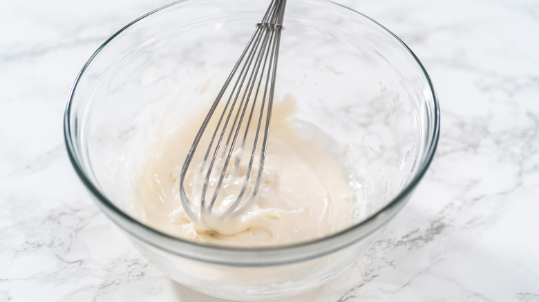 You'll want to make sure that your king cake is slightly warm when you go to glaze it. The radiating heat will allow the frosting to drip down the sides, which will give your cake a rustic look. The glaze can be simple — made with powdered sugar, milk, and vanilla — or you can try a cream cheese adaptation to give it a little bit more tang. The former option will give you a thinner mouthfeel, whereas the latter will make this dessert more like a cinnamon roll.