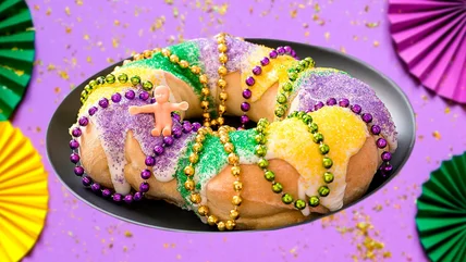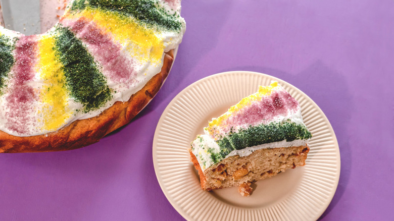 For those unfamiliar, king cake is a must-have treat for Mardi Gras. The dish has Old World origins and was first created to celebrate Epiphany (also known as King's Day). The king cake's precursor is the galette des rois (French king cake) — one of the many interpretations of the dessert from around the world — but most people now associate it with New Orleans' colorful interpretation: a round "cake" covered in frosting and adorned with yellow, green, and purple sprinkles.