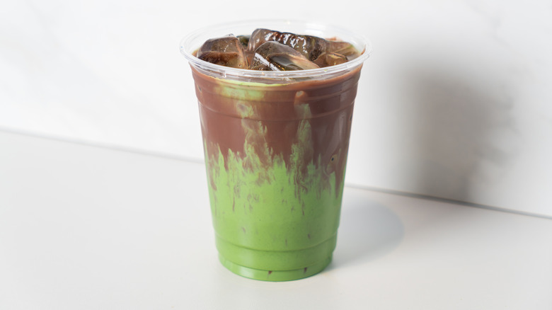 First, you're going to need a matcha powder — but you could also opt for espresso instead. While you will miss out on the color, you could combine them by layering the espresso shot over the iced matcha for even more of a visual effect. You're also going to want a pistachio-flavored coffee syrup (like Syruvia Pistachio Latte Syrup), a chocolate syrup, some cocoa powder, and your chosen milk or milk alternative (pistachio milk being an obvious choice).