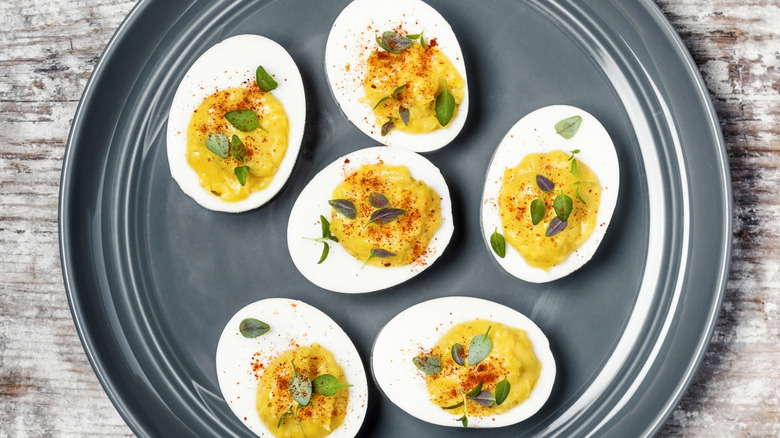 Deviled eggs have lasted the test of time and are still one of the old-school items we're not ready to let go any time soon. Boiled eggs on their own are nothing special, but something about scooping out the yolks, mixing them with all sorts of tasty ingredients, and filling them back up again makes them infinitely more desirable. Just like boiled eggs, deviled eggs are super tasty when cold, and they also travel well. This is what makes them the perfect brunch option to take along somewhere, regardless of whether you're planning outdoor or indoor brunch.