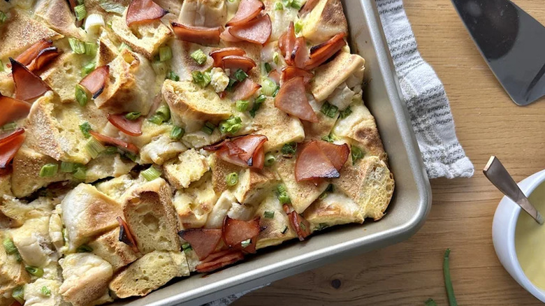 There is one dish that always comes to mind when I think of making brunch, and that is eggs Benedict. It's a favorite option for many, and it's one of those timeless brunch classics that will always be on the menu, even if different establishments like to jazz it up with creative add-ons. However, it's not the easiest brunch dish to transport. To travel with perfectly poached eggs stacked on an English muffin and topped with the must-have hollandaise sauce is a recipe for a cold and soggy mess. Instead, you can get all the flavors of the same dish with half the trouble by turning it into a casserole. Eggs Benedict casserole is just as delicious as the original. It is made by layering English muffins, eggs, bacon, and scallions, but you can tweak it with spinach, other veggies, or any additional spices or herbs you like. Plus, you still get to have your creamy hollandaise sauce, but you keep it separate until it's time to eat.