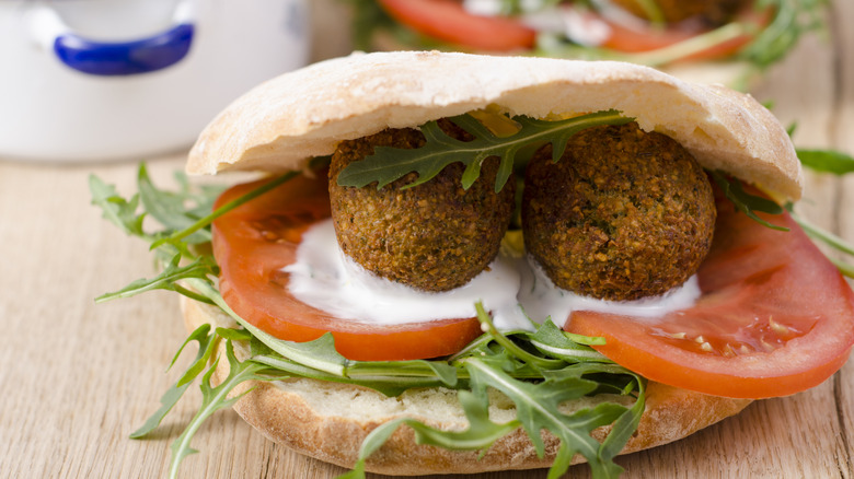 If made well, falafel should be delicately fluffy on the inside and crispy brown on the outside. Additionally, they're not meant to be eaten as a stand-alone snack. Falafel is traditionally served with an entourage of freshly baked pita bread, tahini dressing, a tomato and arugula salad, and some crunchy pickles. All these ingredients are put together to form a falafel sandwich that has all the flavors and textures that make a flavor-packed and balanced bite. Falafel can stay crispy if you fry it fresh on the day of your brunch. Make sure to pack the fillings and pitas separately and allow everyone to assemble the dish with the ingredients they prefer.