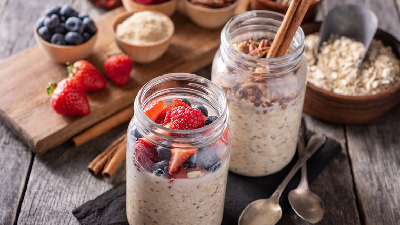 While oatmeal has been a reliable breakfast for decades, it might not scream excitement. But the tide is turning on that, and thanks to the internet, we've discovered and fallen in love with overnight oats as the equally delicious, hassle-free version. There are many intriguing and indulgent overnight oats recipes to enjoy, including those that recreate familiar flavors, such as carrot cake overnight oats. The added benefit is that it's one of the dishes that is incredibly easy to transfer. You can make a big bowl and portion on site or use individual cups or jars that also travel really well.