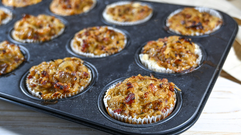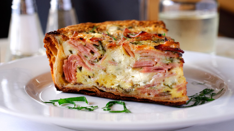 Quiche is one of the most obvious choices to take to a brunch gathering of any kind. Firstly, it's a crowd favorite, and it certainly embodies the concept of brunch. It's eggs, pastry, cheese, cream, and other delicious fillings that all make up a savory, hearty, and rich dish. And it travels well. Whether you can reheat it or not, it's just as delicious cold as it is warm. If it's well cooked, the pastry crust tends to hold up really well and it's unlikely to get soggy even after a couple of hours. It's also a dish that is incredibly easy to serve. All you have to do is slice it up and people can grab a piece. You don't even need plates or utensils. Guests can simply use their hands and a paper towel. This makes it the perfect choice for a picnic or an outdoor brunch.