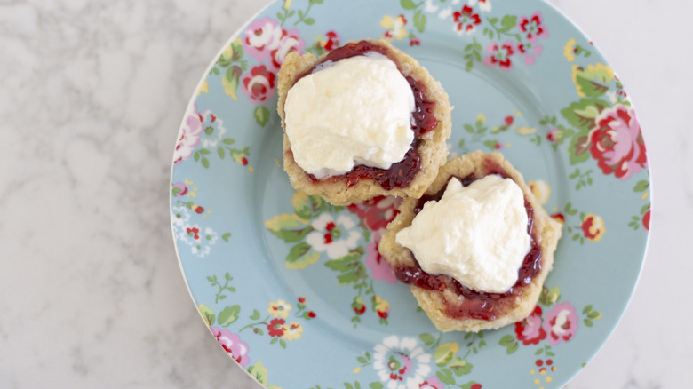 Making scones can be an art in itself, and there are several useful tips you should follow if you want to bake scones at home. However, there's no shame in buying some from your local bakery. Either way, make sure to pack a jar of your favorite jam. You can use whipped cream, but clotted cream is more of a traditional choice. If you're intimidated to make clotted cream, don't be. Your oven and the fridge will do all the work for you. Think of it as baked cream that you let cool and then whip up. It's rich, creamy, and the perfect thing to have on a scone, muffin, or any baked good. Clotted cream also travels really well, since it's really thick and can hold itself together without melting easily. Of course, you don't want to expose it to intense summer heat. Slather it all over your scones along with your jam, and each bite will transport you to a fancy English afternoon tea party.