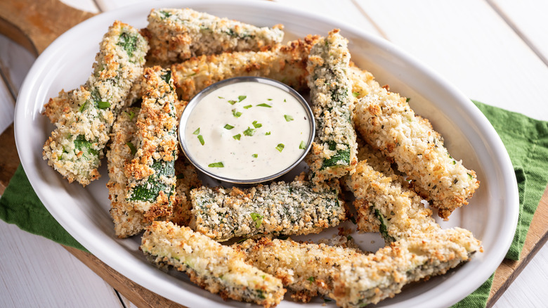 Preparing zucchini fries is fairly simple, requiring the patience to cut your squash into spears shaped for dipping and to mix up the absolute best coating for an unforgettably crispy crunch. You'll also want to carefully pat down your zucchini spears prior to coating them with a binder such as egg whites, mayonnaise, or oil to properly adhere to your flour and panko mixture. Next to your zucchini, the two most important ingredients are the flour and panko with which you'll be coating your zucchini for frying, though the key to flavorful fried squash is all in the seasoning.