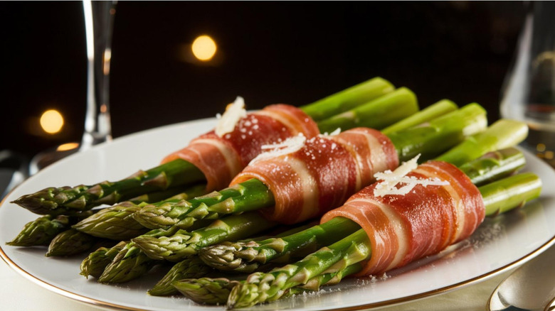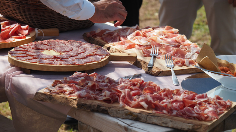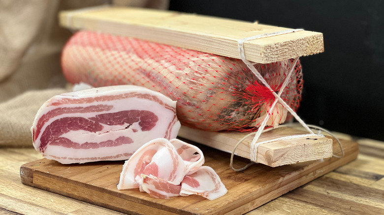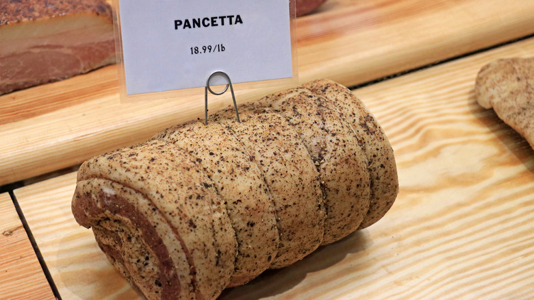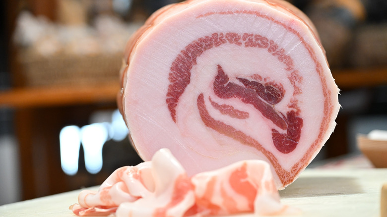 Still, you can make a case for Italy as the world capital of outstanding pork. Dry-cured pork like prosciutto and other kinds of salumi are staples on charcuterie boards everywhere, but oddly, pancetta doesn't get the same kind of love. It's the Italian version of bacon, made from pork bellies just like the bacon you're used to, but it's cured for longer and usually (but not always) rolled up in a tight cylinder.