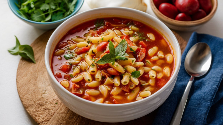 In Italian soups, like the hearty eats like a meal pasta e fagioli, the base ingredient is often pancetta. It's diced into small cubes or cut into thin slices, rendered, and removed from the pot so the fat can be used to cook the onions, garlic, or other aromatic ingredients. Later, the crisped pancetta will be added back as a garnish. The pancetta's flavors pass into the broth as well as the soup's vegetables or starch ingredients, and its fattiness gives the broth a satisfyingly unctuous richness.