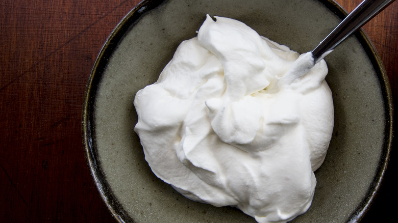 Whipping cream is objectively easier than whipping egg whites because the fat in cream facilitates aerating and stabilizing the liquid into its foamy, fluffy form. In contrast, egg whites are a lot more finicky, as even the smallest amount of fat from the yolk or grease in a mixing bowl will inhibit aeration. We've tested almost every way to make whipped cream and a handheld immersion blender, like this one from KitchenAid, is our favorite tool for the fluffiest whipped cream. That said, it is possible to overbeat whipped cream, and a grainy texture is the unfortunate result. Luckily, you can easily correct over-whipped cream by folding in more heavy cream by the tablespoon until it's smooth again.