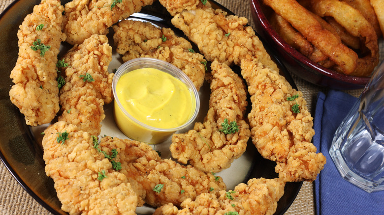 Like horseradish sauce, tartar sauce is often made with mayonnaise, but it works so well with seafood that it's worth mentioning on its own. The recipe for this is pretty simple. It's usually made with mayo, pickled relish, salt, lemon juice, and pepper. The creaminess and tang of the mayo mixed with the sourness of the pickles and the acidity of the lemon juice pairs with just about any kind of fish stick that you can think of.