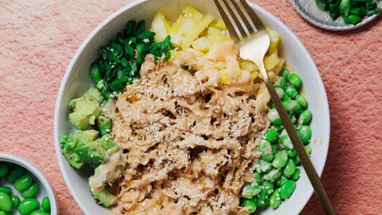 - To assemble the bowls, place a portion of rice in each bowl and top with shredded chicken, sliced avocado, diced fresh pineapple, shelled edamame, and sliced scallions.