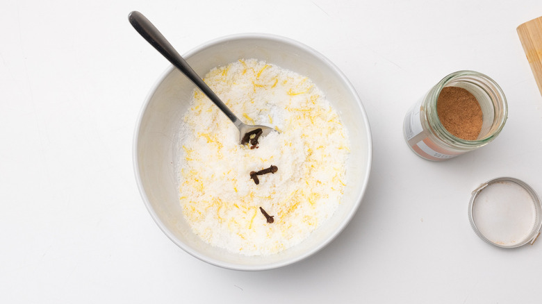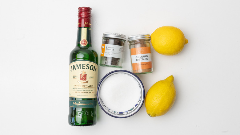 To begin this warm and comforting Gaelic punch recipe, first, you will need to gather the ingredients. You will want lemon zest, granulated sugar, cloves, ground nutmeg, hot water, lemon juice, and your favorite Irish whiskey. To serve, you may additionally want some lemon slices and cloves.