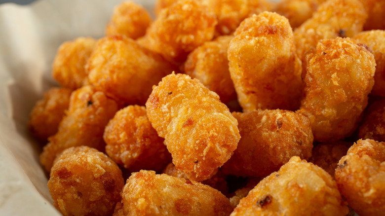 If you've already purchased Great Value tater tots, you can try to correct the unfortunate texture. While the cooking instructions are to bake the whole bag on a tray at 425 degrees Fahrenheit or air fry half the bag at 360 degrees Fahrenheit, you can try increasing the temperature, the cooking times, or both. For example, you could increase the air fryer to 400 degrees Fahrenheit for the same 10 minute cook time. If you're using the oven method, you can tack on an extra 10 or 15 minutes to the cooking time, flipping the tots halfway through for even browning. You can also season them while they're hot, allowing the heat and oil content to dissolve and adhere to the crispy crust.