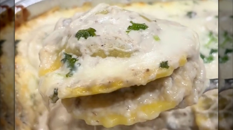 As is typical with new items at Costco, the internet is already devouring and reviewing the offering before Costco has even had a chance to upload any information on the dish. Based on first impressions, the Mushroom Ravioli with Truffle Alfredo looks a little bland. But this isn't an indicator of flavor. In fact, this dish has the same creamy, beige vibes as Costco's Loaded Mashed Potatoes, and that's a seasonal fan favorite. Those who have had the opportunity to bake up the meal have reviewed it positively. One TikToker, @costcohotfinds, had very complimentary things to say about the smell and taste of the pasta, and said that this dish will "definitely be on regular rotation" in their house.