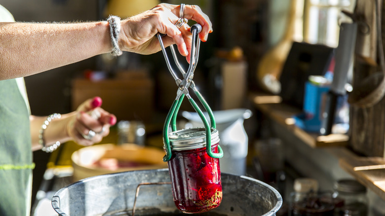 Sanitizing your canning equipment in a pot of boiling water is the best practice for any preservation project, so you'll need to do this for new jars or secondhand ones — just be sure to remove those pesky price stickers beforehand. Another perk of picking up pre-loved canning jars is that you're not limited to a single shape or size. Instead, you have the freedom to play around with varying dimensions depending on what you're canning.