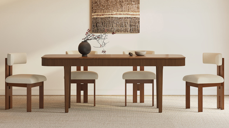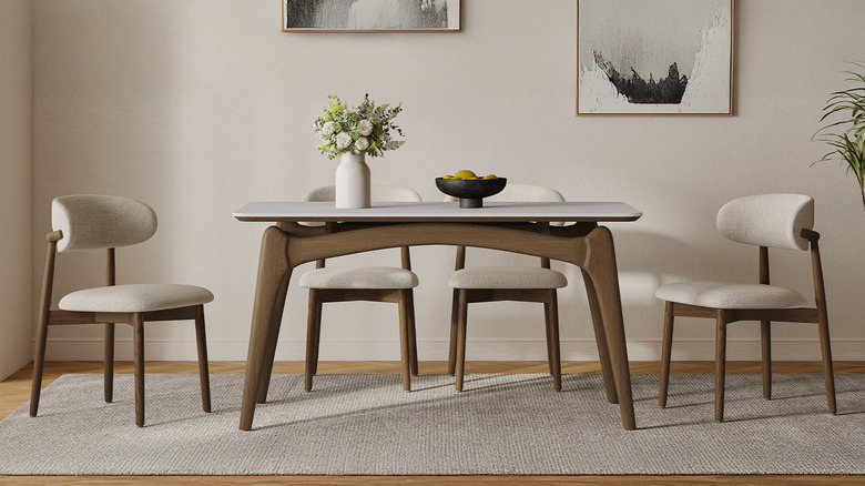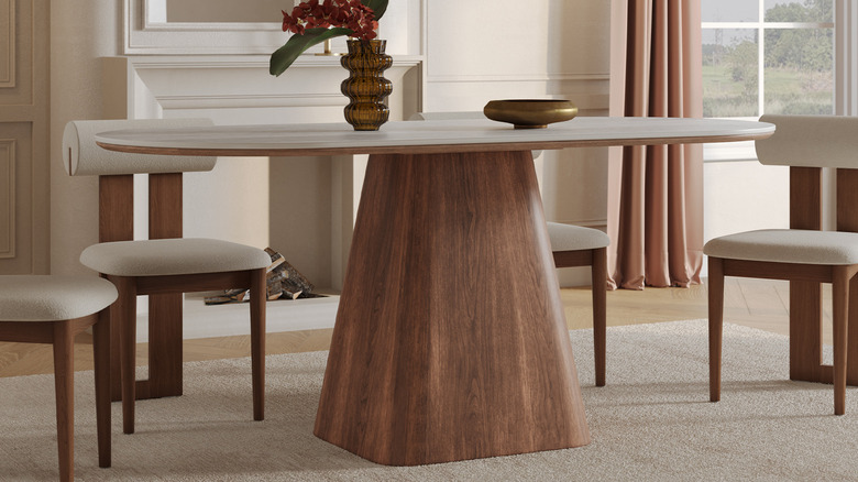 Slightly larger and made of a similar combination of stone and wood materials, the Berit Sintered Stone Dining Table is offered in three sizes: 46-inch, 53-inch, and 59-inch, meaning you can easily pick the best one to accommodate your surroundings. These stone tabletops are built to last and add a warm and pleasant touch to your dining room. If you like warm tones and a more rustic style, Hernest's Esteban Round Dining Table is made from beautiful engineered wood and is designed to be space-conscious. The central pedestal base is a unique feature, which is as eye-catching as it is practical by taking up minimal legroom around the table.
