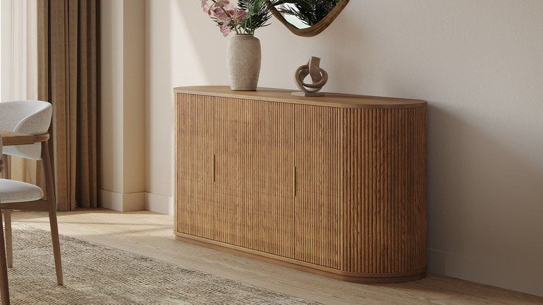 An ideal home-based buffet requires a thoughtful variety of food and a fair amount of creativity. Use a sideboard as the centerpiece upon which to build a buffet teeming with tasty food for warm memories that will last all year long and beyond. Hernest's Rolf Wood Sideboard is a stunning piece that pairs functionality with classic aesthetics. Measuring 62 inches, this plywood cabinet is equipped with two shelves, exterior wooden fluting, and a sleek curved shape. It's the perfect place to store serving dishes, barware, and more with enough surface area on top to place appetizer trays or cocktail glasses.