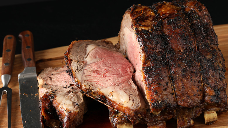 Finally, trust your eyes. "If possible, ask to see a slice before ordering to get an idea of the marbling and overall quality," advises the chef. The ideal combination of the crispy exterior and juicy interior is an indication of a good rib roast, so Gulbro encourages you to "look for a nice crust on the outside, and if you prefer medium-rare, the meat should have a rosy pink to red center." Once you're confident in your choice and have asked all the important questions, don't forget about the ideal beverage — if you ask us, cabernet sauvignon is the best wine pairing for prime rib.