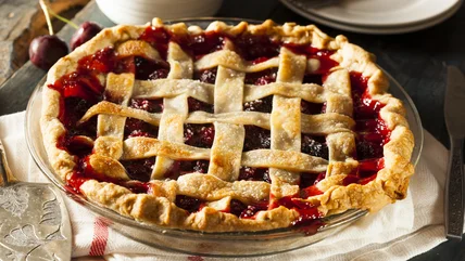 There are a few ways you'll be able to tell that your fruit pie is done baking. The first is color. Regardless of whether you do a classic lattice design or a double crust, the top of your pie crust should be golden brown. A golden brown crust is so much better than a soggy crust that's been under-baked, so when in doubt, let it get some color — just don't let it burn. In addition to color, when your pie is done baking, you will see some of the fruity filling beginning to bubble and appear through any cracks in the crust. Depending on the type of pie crust you have and what's visible to you, you'll want to wait until the filling is bubbling in the center of the pie before taking it out. And don't remove it the second you see a bubble or two — let it sit and bubble for up to 10 minutes or so.