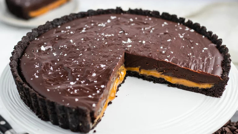There's something about a tart that just feels classy and sophisticated. It may be thinner than a pie, but it still offers the satisfaction of cutting into a slice of sweetness. This particular tart combines dark chocolate with caramel and an Oreo-based crust to make for a supremely indulgent dessert.