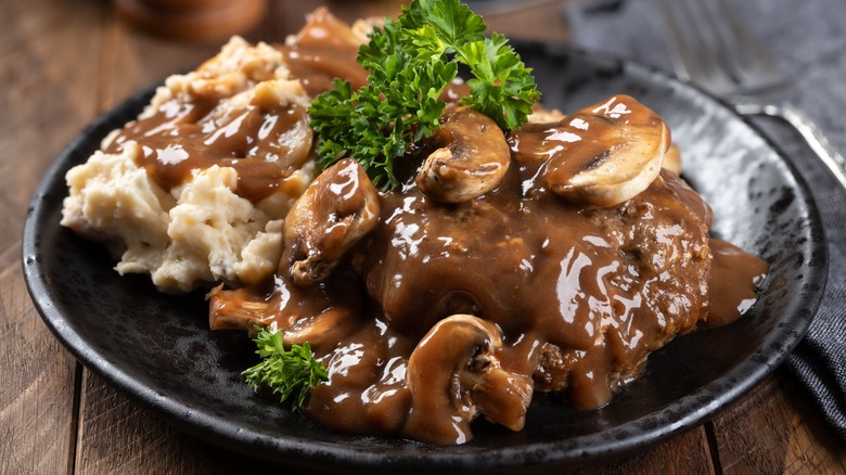 Making a delicious gravy is an absolute must for Salisbury steak, and mushrooms are listed among Chef Jesse Moore's essentials for this reason. In combination with the rest of Moore's recommended ingredients, the addition of mushrooms brings a level of savory vegetable protein, umami, and rich, chewy texture into the mix. While cremini and portabella are ideal choices, you can try mixing up your mushrooms for an earthier gravy rather than using just one type of mushroom.