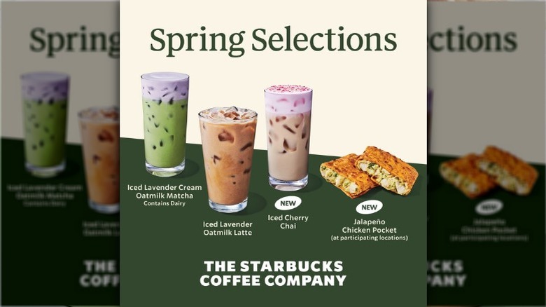 You can also look forward to trying some other new items. While the lavender drinks seem to still be in the works, the Starbucks representative confirmed another drink that will be coming to the Starbucks menu this spring: a new Iced Cherry Chai. You'll also have the option of pairing that with a Jalapeño Chicken Pocket, which was named as a new food item for the season.