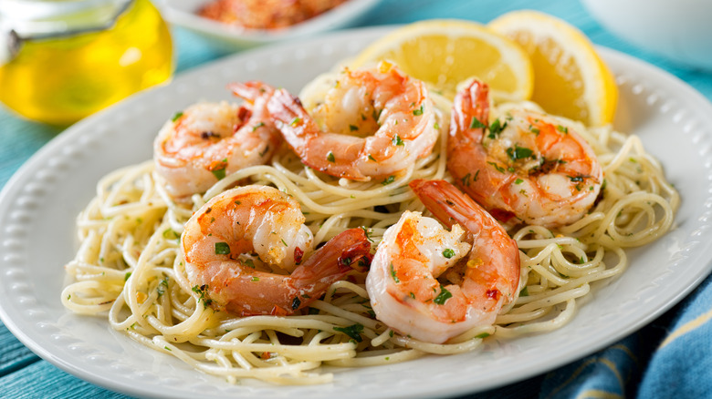 It's no wonder shrimp scampi remains an endlessly popular dish — it's as delicious as it is quick and easy to make. In about half an hour, you can whip up a shrimp scampi just like the one at Olive Garden, maybe better. In addition to the star player (shrimp), these simple, reliably mouthwatering ingredients include butter, lemon juice, white wine, and any number of extras that you decide to add in. Plus, the whole dish is often heaped over satisfying pasta. It's briny-sweet, rich, carby, bright, acidic, and spicy all at once. However, that dreamy balance of flavors hinges on knowing the right types of ingredients to use, and the one mystery can sometimes be that white wine. When a recipe calls for white wine, it can be difficult to know which of the hundreds of specific white wine options is best. So, we asked an expert for advice.