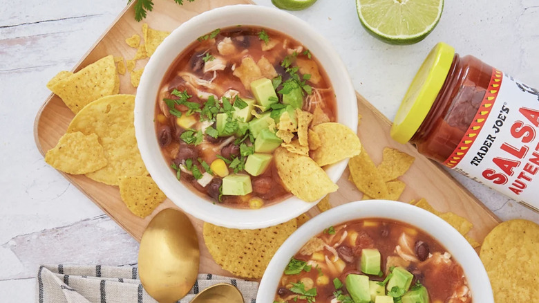 When it comes to flavorful meals, Trader Joe's makes it easy. The refrigerators are filled with prepared foods like salads and burritos and the freezers are a goldmine of frozen entrées, sides, and ingredients. Plus, the combination of fresh produce, marinated proteins, and flavorful packaged items means a delicious dinner is at your fingertips — especially if you're feeling creative. Case in point: Trader Joe's Salsa Autentica, which is both a deliciously simple dip for chips or taco topping and, according to Trader Joe's, the perfect base for a quick and satisfying chicken tortilla soup.