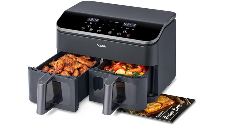 This dual air fryer from COSORI offers a generous capacity to help you cook for a crowd. It also comes highly recommended by customers, with over 1,800 reviewers giving it a 4.7-star rating. It offers two 4.5-quart baskets with independent controls, making it possible to prepare up to 9 quarts of chicken wings, french fries, veggies, and more at a time. Since the temperature of each basket can be independently adjusted (up to 450 degrees Fahrenheit), you can match the needs of two different recipes at the same time as desired. This model also features Smart Sync technology, helping ensure that the food in both baskets finishes cooking at the same time for a well-timed meal.