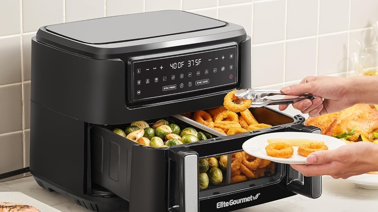 When a standard air fryer simply won't meet your needs, consider this large-capacity Elite Gourmet 11-Quart Dual Zone Air Fryer. It comes highly recommended due to its 4.5-star rating based on over 7,000 reviews. You can use the divider to cook two items, each with a unique temperature. Or, you can remove the divider to create a spacious, 11-quart area where you can cook a 9-inch pizza, 5-to-6-pound chicken, and more to crisp perfection. The air fryer offers a digital control panel, enabling you to adjust the time, temperature, and lights in each section. If you're cooking two different items, you can use the sync settings to ensure they finish at the same time. After cooking, the drawer, rack, and divider can also be cleaned easily in the dishwasher.