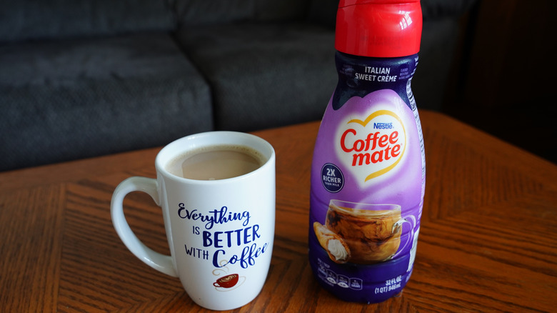 Many popular coffee brands put forth an arsenal of coffee creamers that push the envelope beyond your go-to half-and-half. Take Starbucks, whose brand-name creamers range from non-dairy options to those flavored with caramel. Then, there's coffee creamer giant Coffee Mate, which serves the likes of French vanilla, hazelnut, and caramel mocha across grocery store shelves. Despite this variety, there's one particular Coffee Mate option you can't beat. That variation is Italian Sweet Crème, which ranked number one on Tasting Table's list of the brand's best creamers.