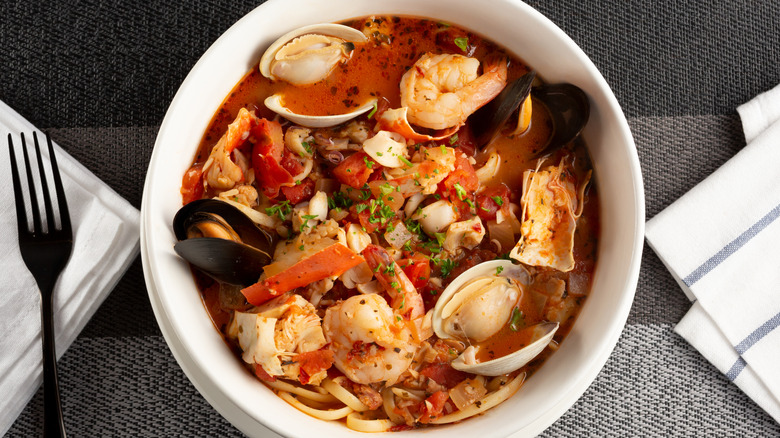 You may know this fish stew as Cioppino, but since we're talking about fish dishes that originated in Italy, we can't very well include it under this name. That's because technically, Cioppino was invented in San Francisco by Italian immigrants from the region of Liguria, which has a longstanding tradition of making ciupin, which sounds suspiciously similar, and indeed, is practically the same thing. The name ciupin comes from the Ligurian dialect word for "chopping" because many of the fish and other ingredients in this stew are chopped up.