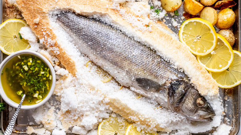 Salt-crusted branzino
