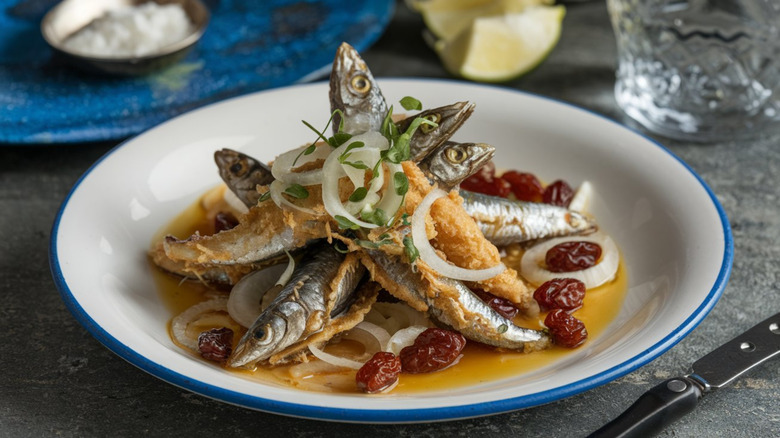 This dish is known as sarde in saor in its hometown of Venice, where it's frequently served as a cicchetto, a small, shareable plate reminiscent of Spanish tapas. As with many Italian dishes, even fishy ones, the process to make sweet and sour sardines is simple: Just dip them in some flour, fry them in oil, and marinate them in onions, raisins, and vinegar — the latter two ingredients provide the sweet and sour elements.