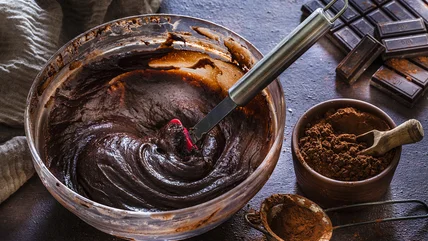 Aquafaba is the liquid found in a can of chickpeas, and it's used as an egg substitute in recipes like our fluffy, almost-eggy chickpea scramble and vegan-friendly tiramisu. Whipped with sugar for several minutes, aquafaba is ideal in brownies because it produces the same delicate and flaky exterior that non-vegan brownies get from eggs. Paired with a fudgy interior — which Vora achieves by folding the whipped sweetened aquafaba with melted vegan butter, melted dark chocolate, flour, and cocoa powder — your vegan brownies will be irresistible.