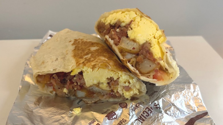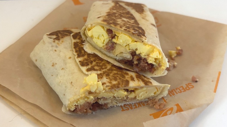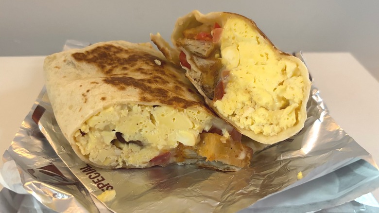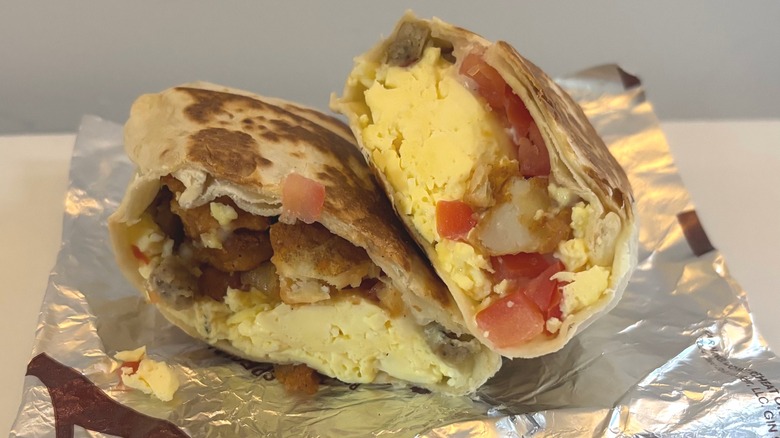 It was immediately apparent upon cutting this burrito open that it was way cheesier than the previous one. Thus, the Cheesy Sausage Breakfast Burrito lived up to its name — almost. Unfortunately, the balance of ingredients was off again in this one, and had there been more sausage, it could have been quite good. When pitted against the chain's other two cheesy burritos, this was a no-brainer choice for the middle spot.