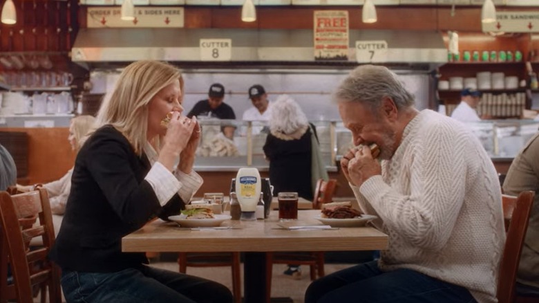 Super Bowl LIX is just around the corner, and big brands are beginning to upload commercial previews on YouTube. "When Harry Met Sally" fans may have noticed some titters on the internet about the two leads pairing up for some sort of reunion, and now we know why. Thanks to the power of the Super Bowl Ad (dollars), we get to see Meg Ryan and Billy Crystal return to Katz's Delicatessen for another orgasmic meal at the same exact table, this time featuring Hellmann's mayo as the third in this rom-com sandwich. The 60-second commercial also features a surprise cameo by none other than Sydney Sweeney.