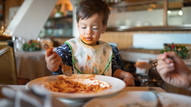As a full-grown adult, bringing a sandwich from Subway into a fine dining restaurant because you "didn't like anything on the menu," is a problem in and of itself. While it's seen as insensitive, inappropriate, and not to mention, flat-out weird to see an adult bring an entire takeout order to a restaurant, there are far more nuances when it comes to whether or not you can bring outside food to pacify young children. As someone who worked in a restaurant, and also someone who would rather sit next to a crying baby on an airplane than an uncontrolled child in a restaurant, I can understand both sides of the coin. However, there are so few circumstances where bringing outside food for kids into a restaurant is acceptable that you're better off not even considering it as an option when it comes time to eat out — but we'll dig into all of the nuances.